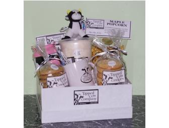 Our gift box is full of great Vermont flavors. *1 tub of Maple Cotton Candy. *1 bag of Maple Popcorn *1 1/2 dozen of our Moo-licious Cookies *1 TCC Coffee Mug *1 Stuffed Tippy Toy *Black and White Taffy *1 Candy Stick *1 10oz Tin of Hot Chocolate All in a reusable photo or video box wrapped in a cellophane bag and tied with a black and white ribbon to make this gift special.