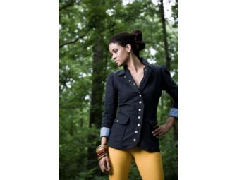 This amazing jacket by Pretty Birdie is made from 7oz hemp and organic cotton. It is fully lined in very soft surplus vintage chambray (100% cotton). The color is black but reads a little navy. It snaps all the way down the front and snaps on the sleeve. Pleated caps on the sleeves and two pockets. The jacket is hip length.