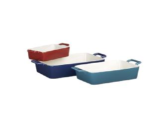 Our popular stoneware bakers go patriotic in bright red, deep blue and teal with matching handles and white interiors. Nesting bakers transition from oven to table to potluck dinner party.