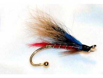 Hand-tied fly brooch pin in an elegant gold-engraved box. Gloria's years as an experienced fly tyer enhances the detail put into each fly brooch pin.