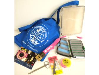 This "tasty" goody bag from the International Women Fly Fishers in support of Casting for Recovery features pin, Costa Sunglass Keeper, Tie-Fast Knot Tyers, Loon Outdoors Biostrike Indicator Putty, Woodstream Fly Box, Scientific Anglers System X Fly Box Inserts, and surgical-quality fly-tying scissors.