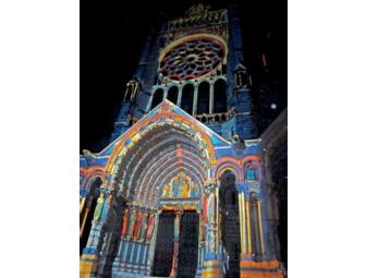 This is a photo of part of the color display that is projected on to the catherdral at night. When printed on metallic paper (which it is not in this copy) it really sparkles.