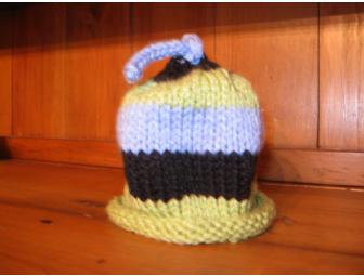Fits 3-9 month baby approximately. Acrylic yarns. The colors are bright green, blue and black. (The picture doesn't quite do the colors justice.)