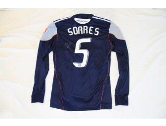 This blue Revolution jersey was worn by defender A.J. Soares in the Revolution's Breast Cancer Awareness Night on Oct. 1, 2011, against Seattle Sounders FC at Gillette Stadium. The jersey is adorned with an MLS W.O.R.K.S. pink ribbon on the right chest, and is autographed on the back by Soares. All proceeds from this auction will be donated to the American Cancer Society's Making Strides for Breast Cancer of Boston.