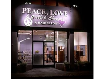 A gift certificate good for a wash, cut and blow dry with Amanda Morris at Peace, Love and Grilled Cheeses A Hair Salon.