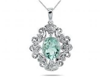 A beautiful, antique and estate inspired pendant set with a stunning 9x7mm natural green amethyst weighing 2.00 carats and 8 sparkling white diamonds weighing .04 carats in total. The pendant hangs from an 18 inch chain also crafted in sterling silver. The pendant and chain are rhodium plated, like white gold, to ensure they will not fade or tarnish.