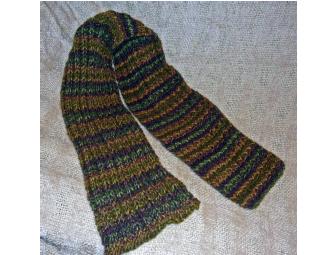 Warm and cozy wool ribbed scarf hand knit in shades of gold, orange, green, khaki, and brown. Looks nice with a man’s coat. Size is 7 inches wide by 48 inches long.