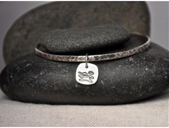The Dog Angel Jewelry bangle bracelet is forged by hand of fine silver (.999) with a distressed, antique finish. The handmade signature charm is suspended on the bracelet, providing a delightful bit of motion and soft jingle.