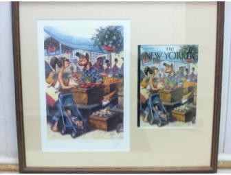 Offered here, a framed, signed artist proof of Peter DeSeve's New Yorker cover, "Small Growers". The proof is matted alongside the cover. The mat is cream and the frame made of wood, duplicating the farmer's crates in the picture,