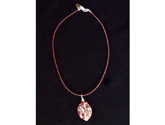 This stunning Kathleen Mailliard SF-CA necklace features a large, autumn orange Jasper Quartz Stone Pendant that is roughly textured and polished to feature the stone's unique detailing and crevaces.