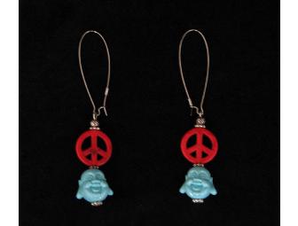 The earrings feature a finely-detailed, turquiose laughing BUDDHA head and a red PEACE sign - both made of resin and strung/clasped with silver jewelers wire and facets.