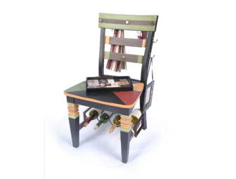 Terry majored in art in college and has been a part-time artist for 30+ years. Her passion for creative work and love of the arts has led to participation in and artistic donations to many local fundraising events. She found inspiration for this chair after spending time with friends relaxing and enjoying their favorite wines. That combined with recent trips to Indiana wineries inspired the colors and theme for her chair.