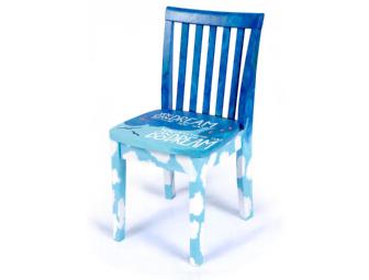 Caitie is a sophomore at DePauw University. The design for her chair is based on her motto: You can dream anything you want, you can do anything you dream. She believes that creativity can turn this world upside down. To reflect this belief she painted the sea at the top of the chair and the sky at the bottom. Her dream is that this chair might inspire a child or two to never stop using their imagination.