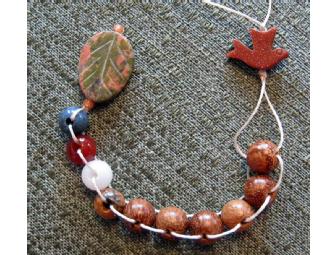 A strand of pocket beads used to pray for peace. The four elements are represented by dumorteirite, carnelian, snow quartz and picture jasper. Wooden beads symbolize the six directions. The dove of peace is goldstone and the leaf is unakite - a stone used for grounding. Comes mounted on a card with explanation.