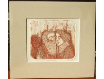 Original etching “Cornish Gothic”, signed and numbered, by noted artist Carol Lummus. Plate is 8” by 6.5”; light beige matte is 13”x11.5”. It is in mint condition. Humorous takeoff on American Gothic.