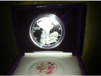 The American Eagle One Dollar is a 1989-S. The US Mint certifies that this coin is proof version of the US silver Bullion coin. The coin is encased and is displayed in a purple velvet case. The coin also includes a certfificate of authenticity.