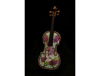The violin was created using vitreous glass, stained glass, mirror and beaded pull chain. The stained glass was chosen specifically to capture that redbud pink and the vibrant spring greens. The design was laid out and glued on nylon mesh, later transferred onto thinset spread over the violin, and finally grouted.