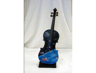 I am so glad that I was chosen to paint the "Star Wars" theme! I had previously painted the two scenes as large murals for a client who was a huge Star Wars fan. The design on the front is called "the Battle of Endor", a scene from "The Empire Strikes Back." The design on the back is called "Coruscant", which is the home world of the Empire. It was actually quite challenging to shrink it all down to fit onto a small and oddly shaped surface like a violin. I began by priming the wood with acrylic gesso. This gives the paint an acceptable surface to stick to. The overall designs were then sketched onto each side and the basic shapes were painted in with acrylic paint. Details were added next to finish the scenes. Finally, the entire violin was coated with varnish to protect the surface. "May the force be with you"
