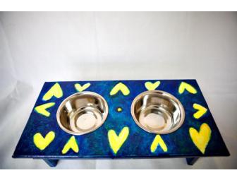 This stand is painted with a nice rich blue color and little yellow hearts as pops of color. (These little hearts will remind your pet how much he/she is loved every time they use the stand!)We also love the texture that was somehow created with the paint! Art by San Diego artist Donna Butnik.