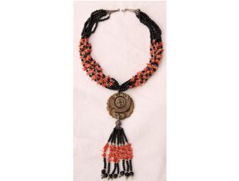 Beautiful and unique beaded, coral and carved stone necklace from Egypt. Necklace is approximately 15" long.
