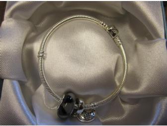 Pandora bracelet with 2 charms, one of which is the Breast Cancer awareness charm.