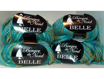 SILK? Did someone say silk? Yup. We have four super silky skeins of Berger du Nord's Belle 100% Silk for you in the coolest blue green with touches of yellow here and there. This is beautiful yarn - that beckons you to BID!