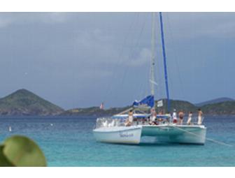 Enjoy the best of the Virgin Islands on this exclusive half-day sail from St. Thomas to the enchanted island of St. John on board a custom-designed catamaran. Experience the thrill and excitement of sailing the Caribbean before enjoying one of the lovely palm-fringed beaches of St. John. Your relaxing but fun-filled day begins with a short scenic ride to a quaint marina where you will board your catamaran. At the marina dock your friendly crew will greet you and acquaint you with the vessel. You will then glide along the eastern end of the island before setting sail to the most pristine of the U.S. Virgin Islands. The brisk sail across Pillsbury Sound brings the catamaran to its special mooring destination where you can swim to a beautiful St. John Beach, snorkel, beach comb, or simply relax under the palms. Enjoy freshly baked breads, cheeses, fruits, and a variety of beverages onboard. Champagne and other beverages are complimentary after swimming and snorkeling. After your relaxing stay at the beach, delight in the tropical breezes as you make the downwind return sail to St. Thomas.
