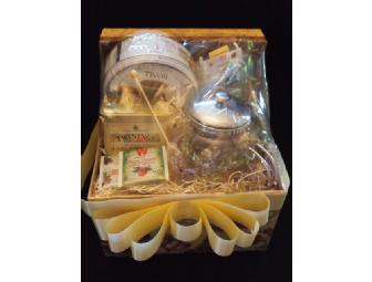 Tea lovers will enjoy this basket filled with tea time goodies. This beautifully arranged basket contains a glass teapot with strainer, a glass tea cup, assorted Wissotzky teas and a tin full of delicious Tivoli Danish cookies. Enjoy!