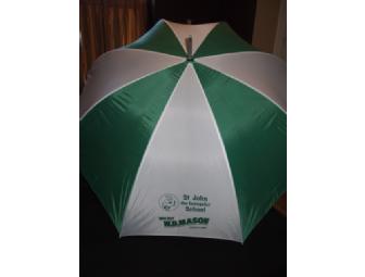 Don't let rain get in the way of your golf game. Keep dry on the link with this green and white golf umbrella. The SJE Eagle and School name are proudly printed on one of the white panels. The W.B. Mason logo is also featured on the same white panel. Show your school spirit and stay dry at the same time.