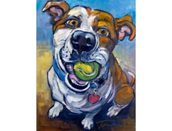 This original Stubby painting measuring 18" x 14" on gallery wrapped linen is a combination of the artist's 1st pit bull named Co-D and her pit mix, Maggie. Both of whom LOVE to play ball.