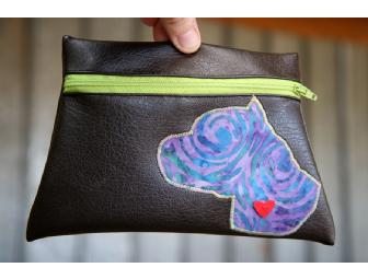 This pit bull silhouetted pouch (inspired by a three-legged pit bull rescue, named Wilbur) is perfect to fit in your purse or carry by itself. The pouch is lined with the same colored fabric as the pit bull silhouette.