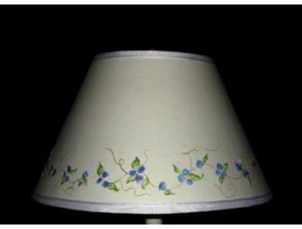 Hand painted, cut and pierced, Blueberry Shade. Brass colored washer top: 6" top to 14" bottom and 10" tall. Top and bottom finished with double grosgrain ribbon.