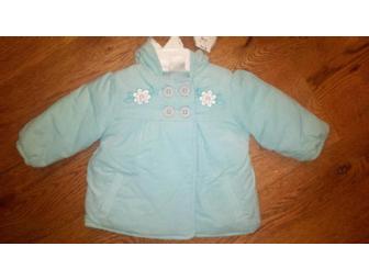 Koala Baby Girls insulated winter coat. Pretty pale teal corduroy with embroidered flowers. Button front, empire waist. Size 3-6mos. This item is new with tags showing $24.99 retail.