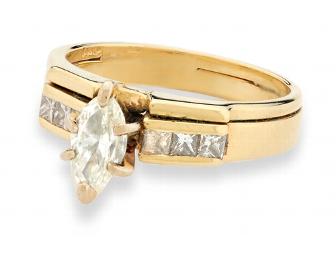 This ring has a .6 carat marguise diamond with I-color and VS-2 clarity set in a 14 kt gold ring with channel set princess diamonds totaling .32 carats. This ring is a size 6.75.