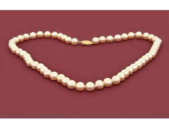 Necklace Specs: This necklace is a single strand of knotted Akoya cultured pearls with approximately 57 mostly round white cultured pearls, and finished with a 14k yellow gold ribbed clasp.