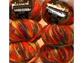 These seven skeins of Versatile by Plassard burst with a rainbow of autumnal colors including yellow, rich green, orange, hot red, sky blue and purple. It is 100% wool but soft and friendly. It looks like a walk in the woods on a perfect Fall day, but you can wear it!