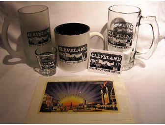2 tankard mugs (1 frosted, one clear), 1 coffee mug, 1 shot glass, 1 magnet and a vintage style greeting card, depicting a Cleveland landmark (but not with the phrase).