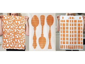 This set of tea towels is printed on the finest 100% European linen. Colors: orange ink on oyster white.