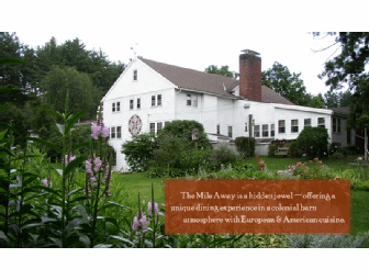 The Mile Away Restaurant located in Milford serves European and American cuisine in catheddral post and beam barn with grand fireplaces and antique wood paneling.