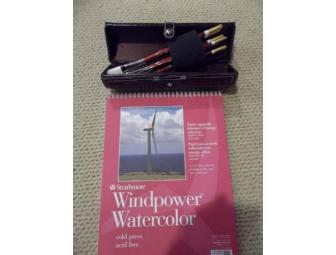 Deluxe water color paint set in a wooden box with a deluxe watercolor brush set in a case and paper to paint on.