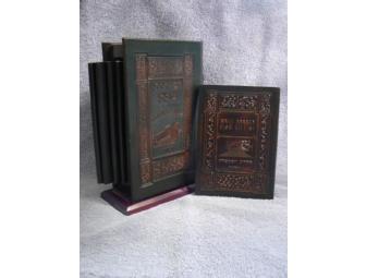 This set of six Zemirot books in soft leather comes with an impressive wood stand, decorated with an engraving of the Cave of the Patriarchs.
