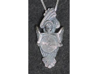 Labyrinth Seraphim pendant in sterling silver. 1 1/2 inches tall (38mm), 3/4 inches wide (18mm) on 20" sterling box chain.