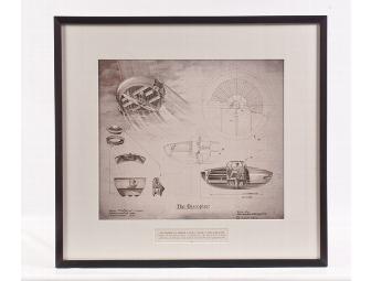 Sure to spark the imagination of kids of all ages, this collectors poster depicts the world's first patented flying saucer, The Discopter. This piece contains sketches and schematic drawings created by bay area inventor Alexander Weygers in 1950. Custom cream matting and dark-wood framing. Nice enough for any room in the house.