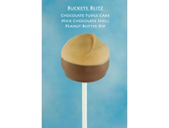 A one dozen (12) box of Buckeye Blitz Cake Pops! Chocolate Fudge Cake with Milk Chocolate Shell and Peanut Butter Topping.