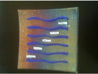 The veins and stents will be on iridescent-clear glass. 81/2 X 81/2 inches square. It is slumped into a dish shape. Winner needs to understand that the glass has a voice of it's own, at 1500 degrees. A bit like Raku firing in ceramics. Each piece is unique, and has a handmade feel. Slight variation is considered part of the design.