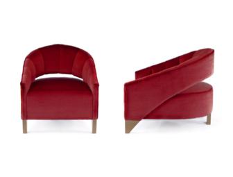 The Geena chair designed by Dennis Duffy of D SCALE and made locally by Furniture Concepts. Upholstered in plush, vibrant red mohair courtesy of Kravet Couture and set on hand-made silver leafed feet by Avatar East.