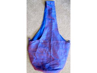 Natural Thai silk forms a durable shoulder bag with traditional knot closure. A blend of blue and purple creates an almost iridescent fabric.
