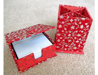 This desk set is hand made using fair trade practices. The craft person has ensured that the pattern matches on all sides - a detail that costs more material but creates a much nicer finish.