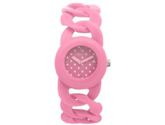 Samba Acetate watch by Roxy with a chain-link pink band and a pink polka-dot face.