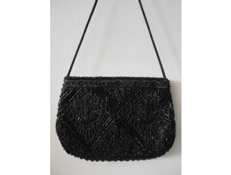This beaded black lady's evening purse is approximately 8" X 6.5," with a shoulder string-like strap.  The purse was made in China.